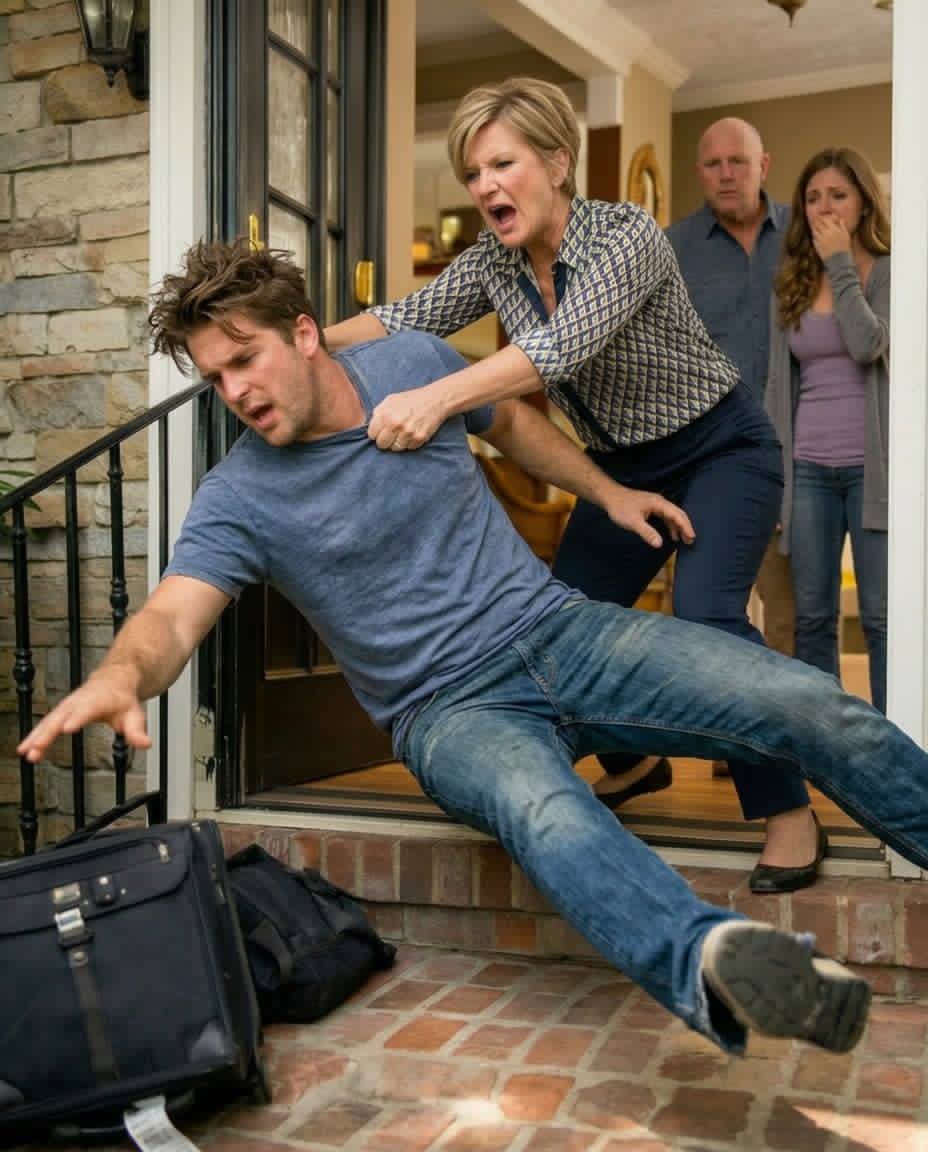 Si avventò su di me, mi afferrò il braccio e mi spinse verso le scale che portavano alla porta d'ingresso.