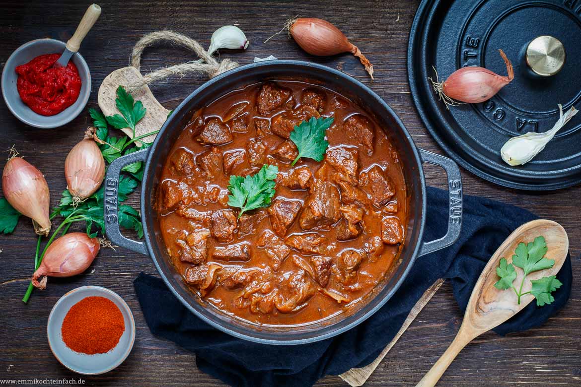 Una caratteristica speciale del mio goulash è l'abbondanza di scalogni. Non solo aggiungono un delicato sapore di cipolla leggermente dolce, ma creano anche una salsa meravigliosamente cremosa. Altrettanto cruciali sono la qualità della carne e la rosolatura graduale, che garantisce intensi sapori di arrosto, anche se richiede un po' di pazienza.