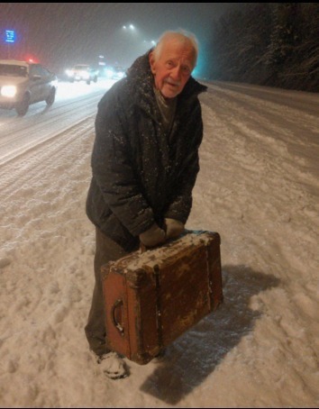 Stavo tornando da un viaggio di lavoro, ma ero sollevato che tutto fosse chiuso per le feste. A una curva, i miei fari illuminarono l'auto accartocciata di un anziano signore, che procedeva lentamente, trascinando una valigia malconcia.